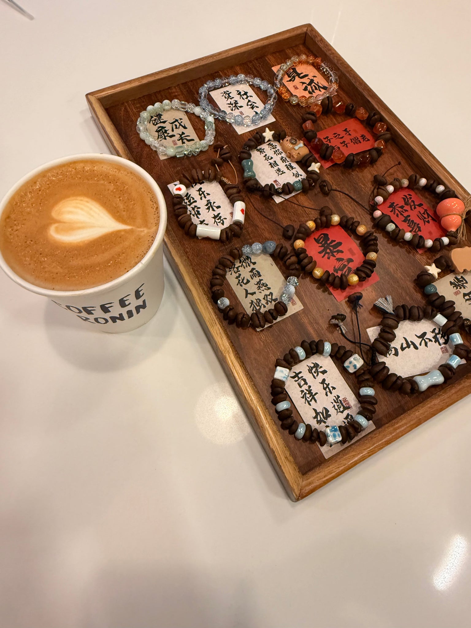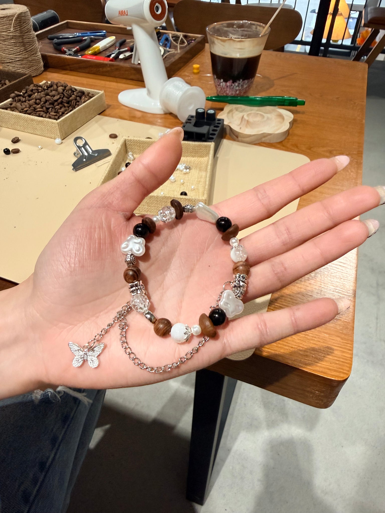 Create a unique bracelet using real coffee beans and selected beads.